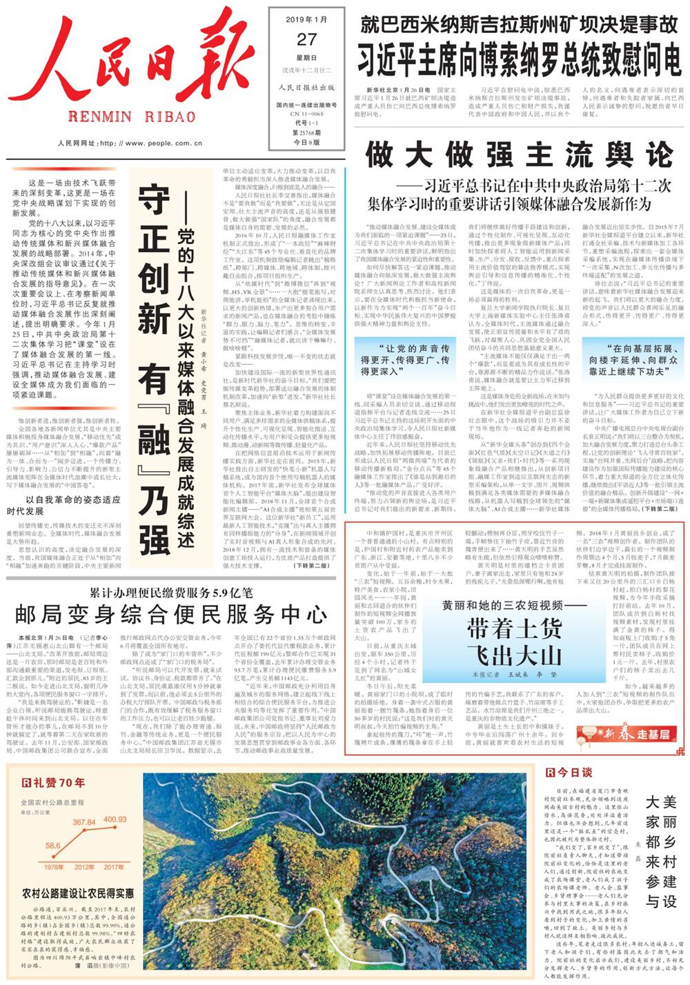 平武農(nóng)村公路建設(shè)項(xiàng)目助力決戰(zhàn)決勝脫貧攻堅(jiān),2019年1月27日被《人民日報(bào)》選刊作為禮贊中華人民共和國70周年專題事跡附圖。