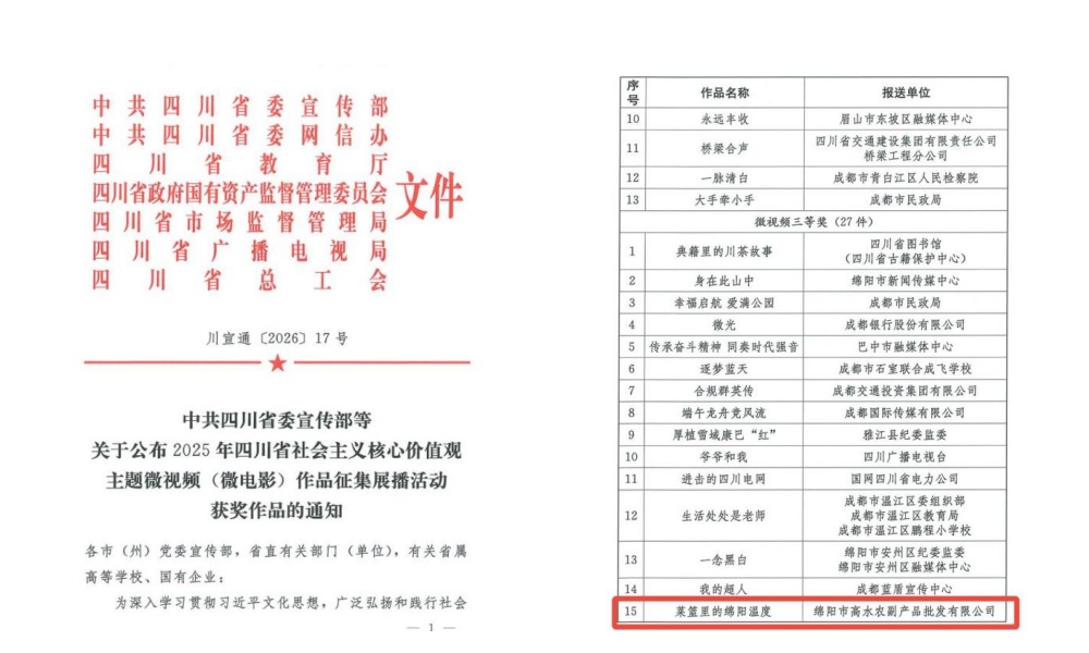 近日,由四川省委宣傳部聯(lián)合省委網(wǎng)信辦、省國資委、省總工會等七部門主辦的“2025年四川省社會主義核心價值觀微視頻(微電影)作品征集活動”評選結(jié)果正式公布。高農(nóng)司報送的的紀(jì)實(shí)微視頻——《菜籃里的綿陽溫度》,從全省數(shù)千部參賽作品中脫穎而出,榮獲三等獎,系綿陽市國資系統(tǒng)唯一獲此殊榮的民生題材作品。
